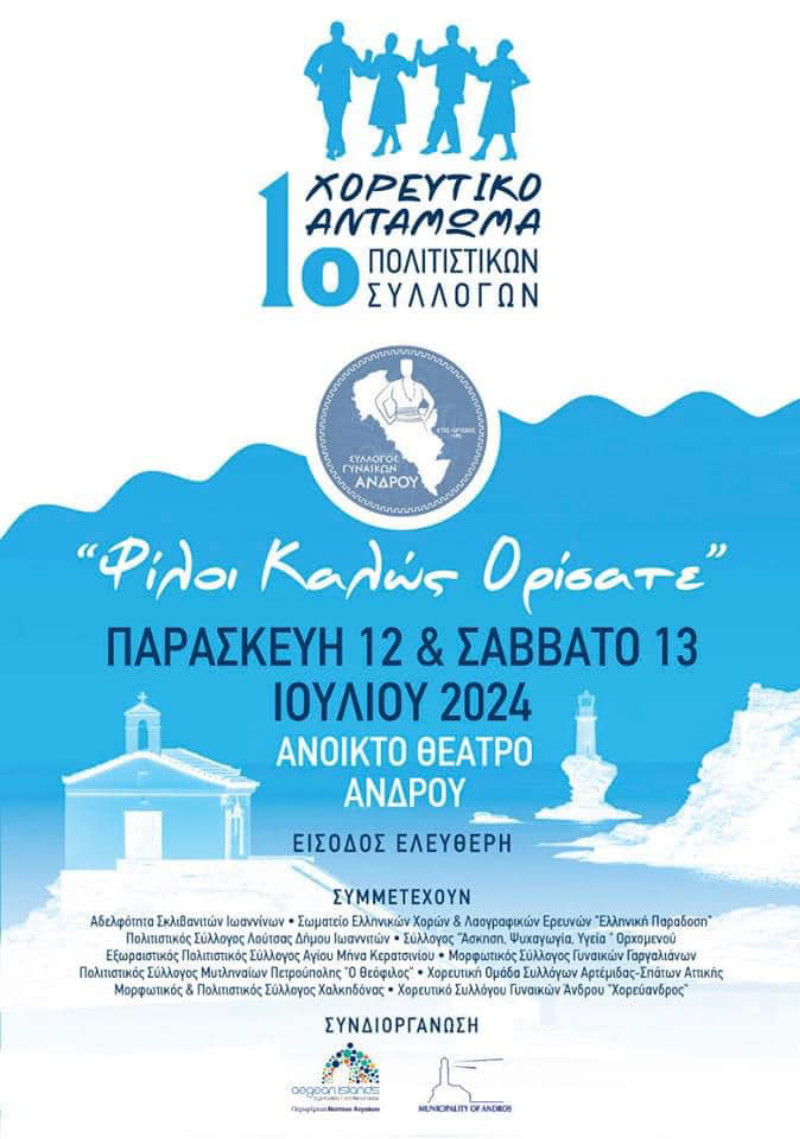Πάνω από 200 χορευτές και άλλοι τόσοι συνοδοί προσκαλεσμένοι του Συλλόγου Γυναικών Άνδρου θα έρθουν στο νησί μας 12 και 13 Ιουλίου φέρνοντας χορούς και τραγούδια από κάθε γωνιά της Ελλάδας! Συμμετέχει το Ανδριώτικο Τακίμι.