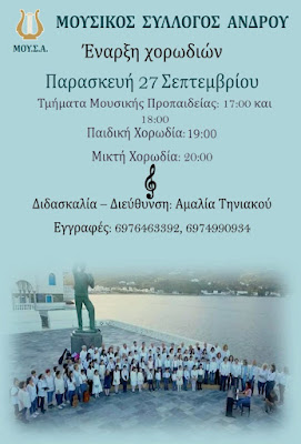 Ραντεβού την Παρασκευή 27 Σεπτεμβρίου για την έναρξη της μουσικής μας χρονιάς με κέφι, χαμόγελο και αγάπη για τον Σύλλογο, την Άνδρο και τη μουσική!